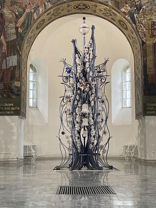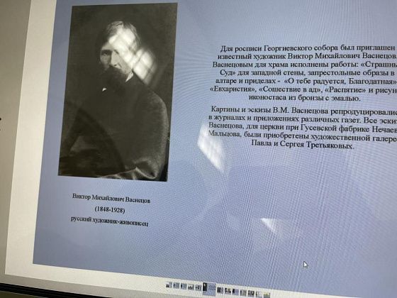Виктора Васнецова “Страшный суд”. Полотно размером 7 на 7 метров. В переломные годы его успели снять, картину накрутили на большой вал. Потом вернули на прежнее место. Картина при этом немного пострадала, ее пришлось реставрировать. На стене напротив расположена мозаика, посвященная Богородице. Ее создал мозаичист