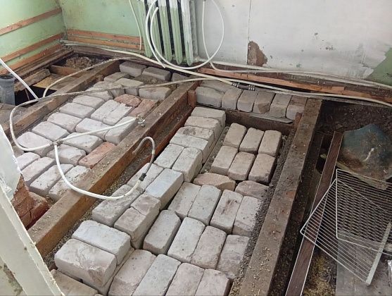 В начале июня к нам в гости на три дня приехали сестра с зятем, оба архитекторы - чтобы помочь начать ремонт. Планировали класть кафель на имеющийся деревянный пол. Но зять посоветовал от старых полов избавиться - иначе не факт, что плитка на досках со временем не начнет “гулять”. Вскрыли доски, выяснилось, что они довольно уже гниловатые. А под досками оказались глубокие, сантиметров 90, пустоты, которые в течение целого дня мы дружно, в 8 рук, закладывали всем, что оказалось под рукой - бэушными кирпичами, щебенкой, которую привезли, чтобы отсыпать дорожки в огороде, кусками арматуры, даже старыми металлическими кастрюлями. Верхний слой, сантиметров 30, бетонировали. Только на подготовку полов для укладки кафеля ушло два полных дня, с раннего утра до поздней ночи. После полы пришлось еще залить самовыравнивающейся смесью, чтобы по уровню было.