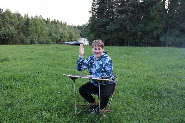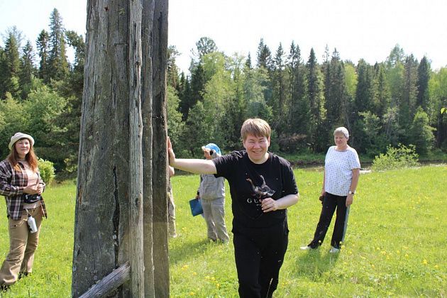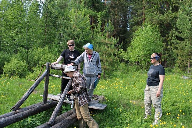 На поляне обнаружили старую домашнюю парту вместе со стульчиком, которая напомнила всем школьные годы. Она, как и древняя сосна, стала местом для фотосессии.