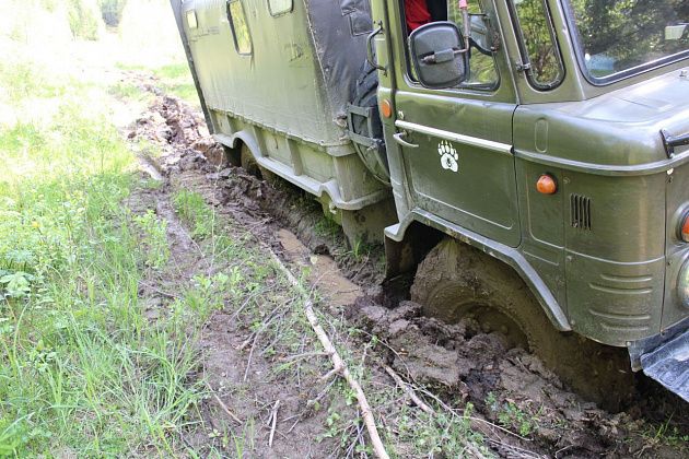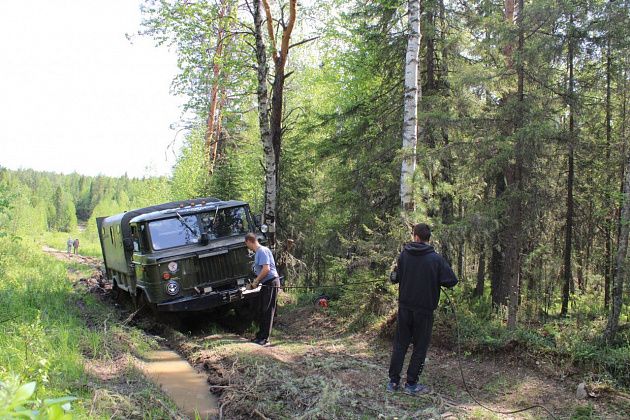 Не стану рассказывать, как примерно посреди (или чуть раньше) пути “сели” в колею. Миша намеренно повез нас сложным путем, чтобы было что вспоминать. Вытягивали вахтовку при помощи лебедки, мальчики участвовали в процессе, девочки с интересом наблюдали.
