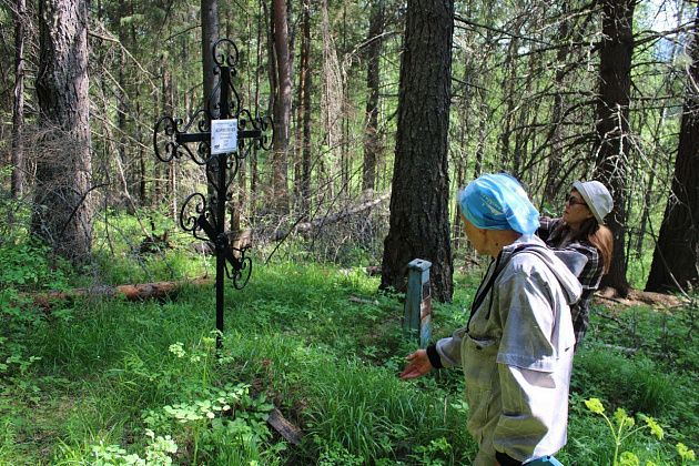 Зашли на старое кладбище, поклонились могилкам, точнее, тому, что от них осталось. Есть среди холмиков и новый современный крест с надписью, его не так давно установили потомки жившей тут когда-то Стефаниды Ивановны Корионовой, родившейся в 1893 году.