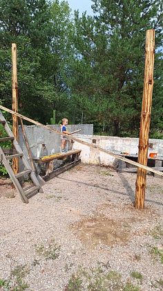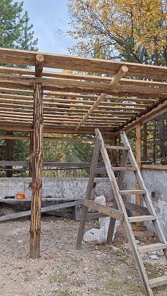 После того, как депутат Арсаев подтвердил, что материал для кровли предоставит, начали стройку. Из металла делать не решились, слишком дорого. Купили бревна и доски, шкурили Александр Онуфриев и Алексей Малошенко. Еще один сосед Паша Султукаев помог бурить отверстия под столбы. Установили.