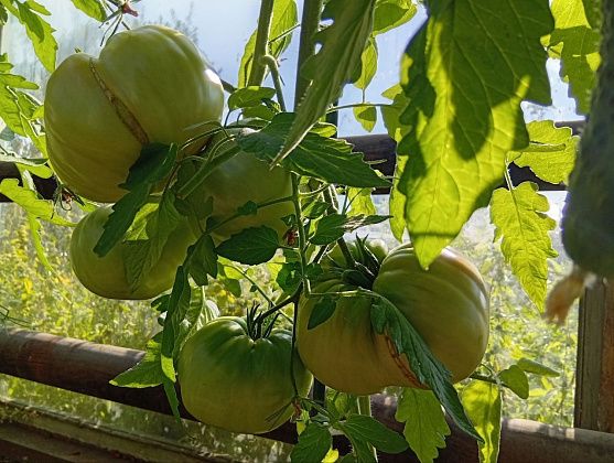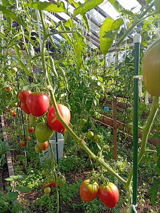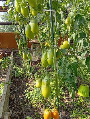 Малиновые купола, об этих помидорах я писала не раз, они прекрасно подходят для консервирования, ровные, кругленькие, на кусту - гроздьями, одного размера, с мелкими семенами. Поскольку в этом году я высадила их, минуя этап пикировки, созревание тоже немного затянулось, только-только начинают желтеть и краснеть.