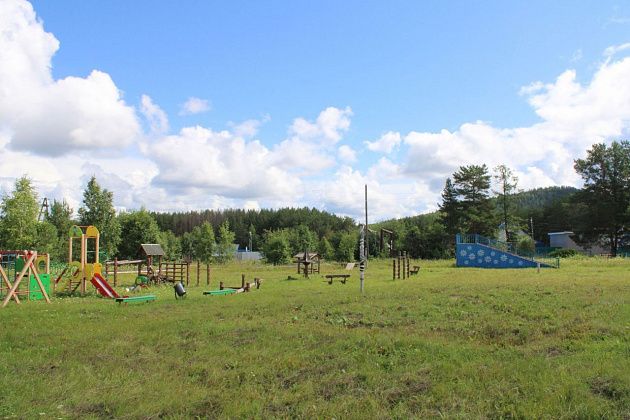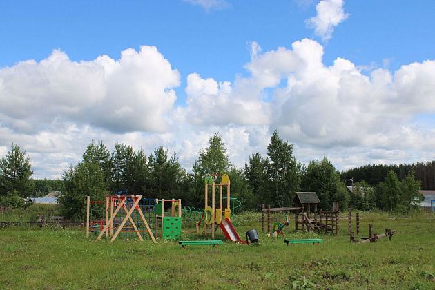 Рядом с огороженной площадкой для футбола-хоккея имеется также детская площадка. Трава на ней скошена. Но это, как утверждает Александр Цепелев, заслуга частников, которые живут рядом - то ли коровам косят, то ли кому. Чуть поодаль от игровой площадки - большая металлическая горка, ее, по словам Александра, тоже привезли и установили года три назад, тоже не новую.