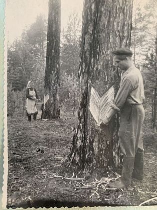 Александр Пустуев работал и на заготовке леса и живицы – древесной смолы, которую тоже поставляли на фронт. Причем Александр освоил самую тяжелую и опасную работу вздымщика, висел на деревьях, резал хаком стволы для сбора живицы. Так на делянке в лесу во время рабочего дня Александр и узнал об окончании войны.