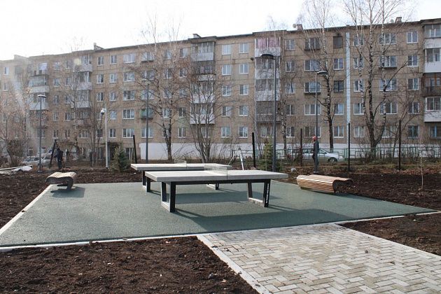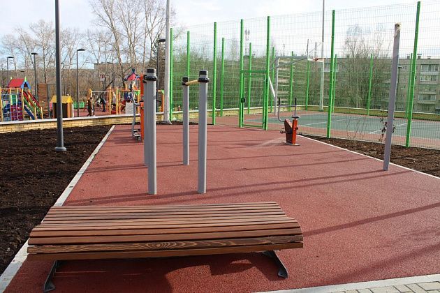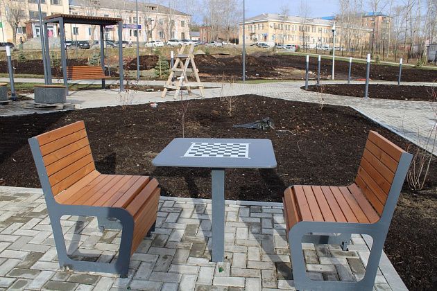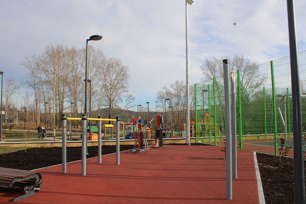 Имеется два теннисных стола, массивных, как будто бы каменных, столик и кресла для игры в шахматы, клетки начерчены прямо на столе. Есть площадка с тренажерами, она открыта для посетителей. И детские площадки, которые уже облюбовали малыши.