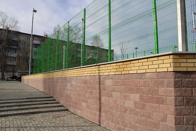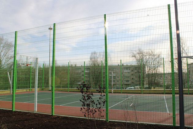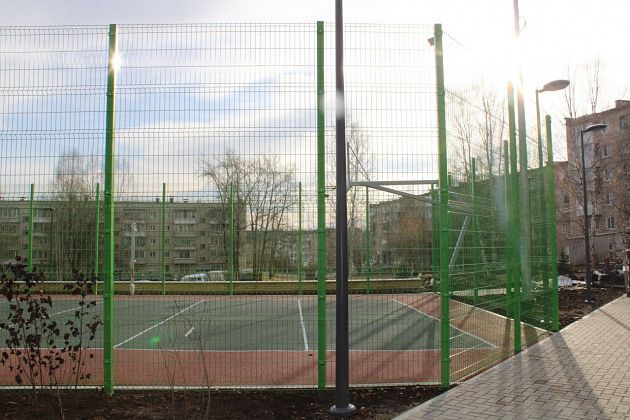 Готова просторная баскетбольная площадка, она огорожена высоким металлическим забором с воротами, они пока на замке.