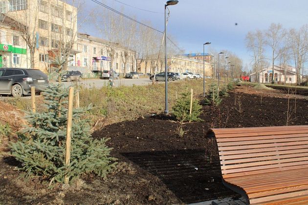 Почти все пространство, на котором есть и будут зеленые насаждения, уже отсыпаны ровным слоем хорошей земли, без щебенки и камней. Высажено много симпатичных, красивой формы елей, не маленьких, 50-сантиметровых, а приличных, метра полтора высотой. Также насажены кустарники вроде пузыреплодника, как на площади Мира. По центру сквера - большая круглая клумба, вокруг которой 7 столбиков с подсветкой. Все дорожки внутри сквера выложены тротуарной плиткой. Много лавочек разной формы - есть со спинкой, есть без.