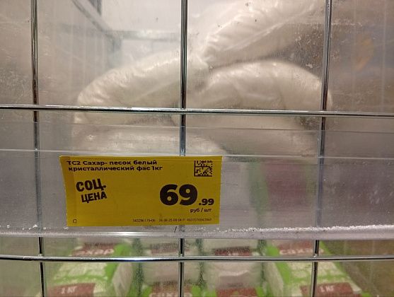 Сахар, “Пятерочка” - 69.99 рублей, “Магнит” - 69.99 рублей, “Доброцен” - 64.90 рублей.