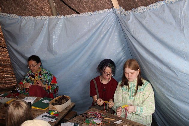 Захожу в чум, установленный на площади Ивделя, он достаточно большой. Здесь, за низкими столиками, расположились приезжие гости из ХМАО, показывают, как изготовить оберег или фенечку.